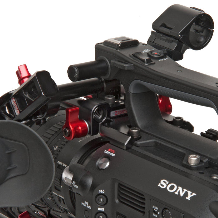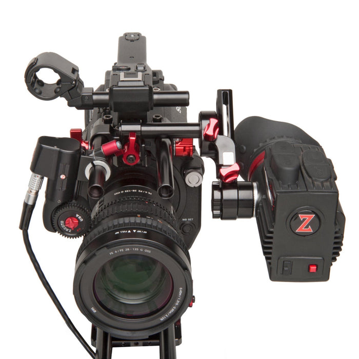 The Axis Mini for Sony FS7 and Sony FS7 II attaches to your rig via the included FS7 Rod Lock, which attaches to the FS7 body in front of the Sony top handle. Slide the Axis Mini into the extra 15mm rod port on the FS7 Rod Lock and clamp into place. The Axis Mini for FS7 attaches to the Sony monitor via a secure rosette mount adapter.