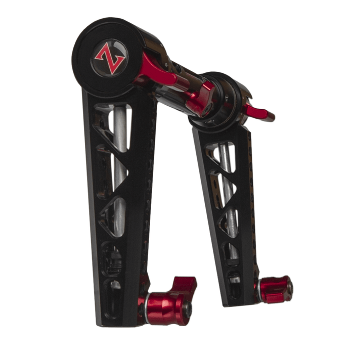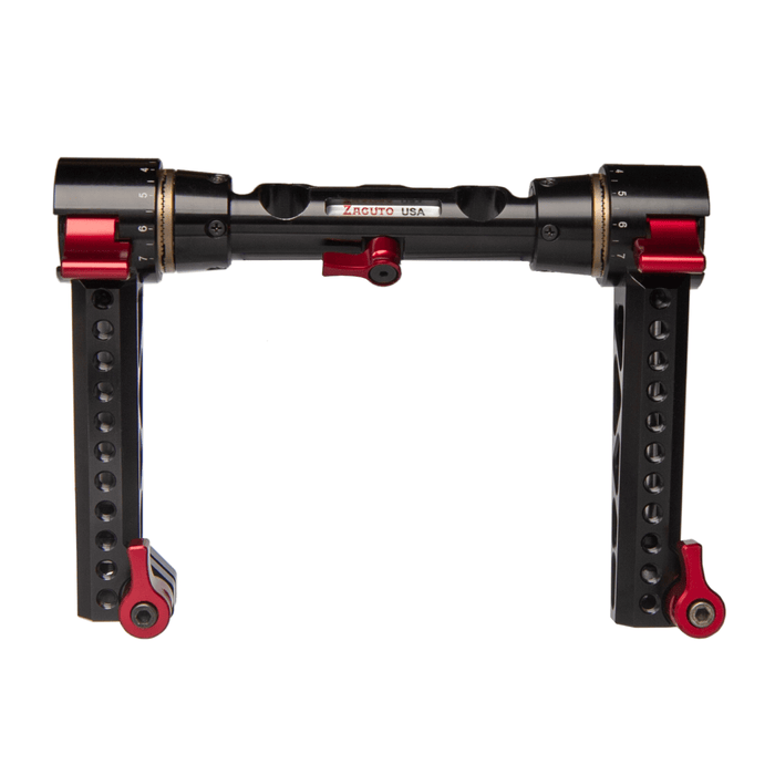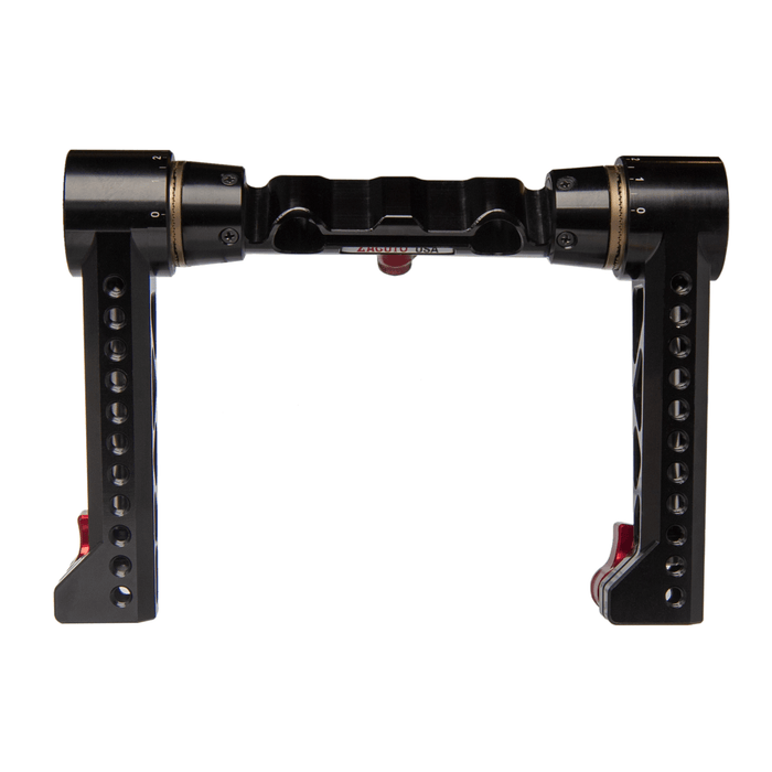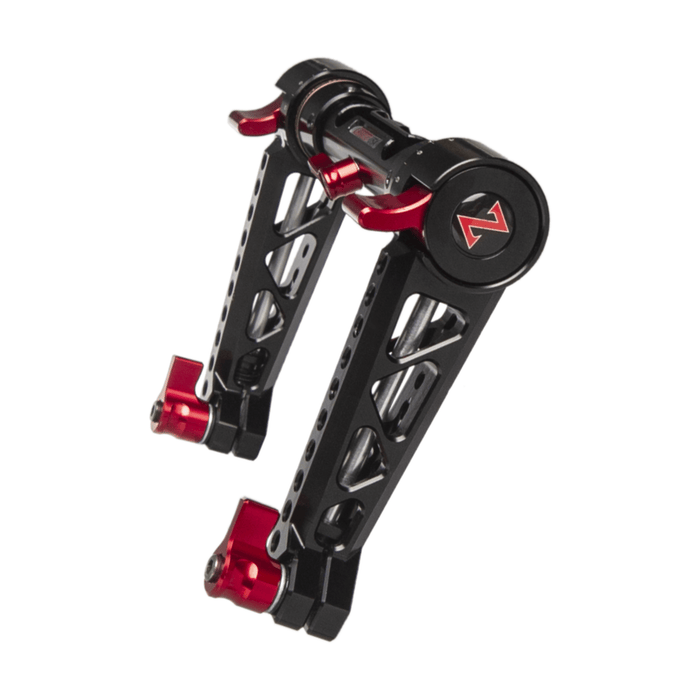 The Dual Trigger Grip Base slides onto 15mm lightweight rods. They allow for single-handed 360° rotation with the simple press of a trigger. The two handles rotate independently of each other. Flip them down for a low, rock-solid handgrip. Raise it up for more of an Aaton style position. Or quickly flip them both all the way up to set your camera flat on the ground or for storing in a case. Or stagger them if that is more comfortable you. The length of the handgrips can also adjust- they can go from 13” to 16” measuring from the base to the bottom of the handgrip.