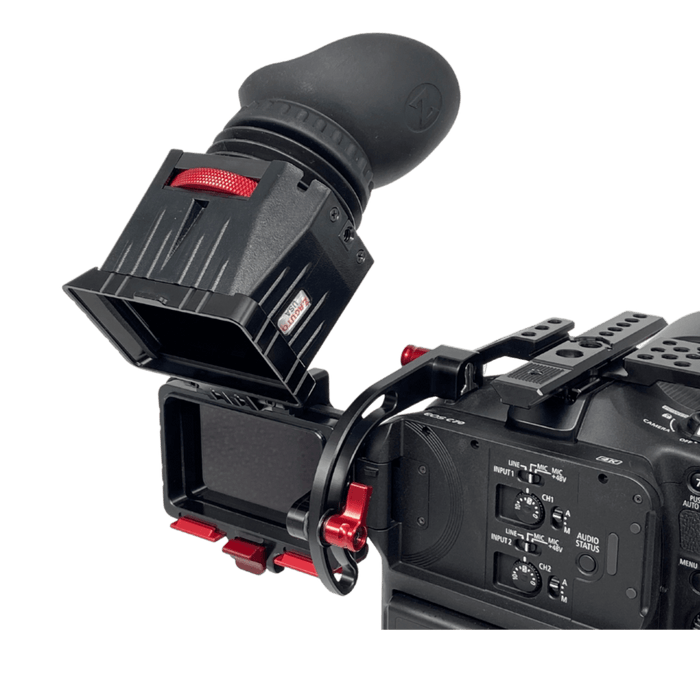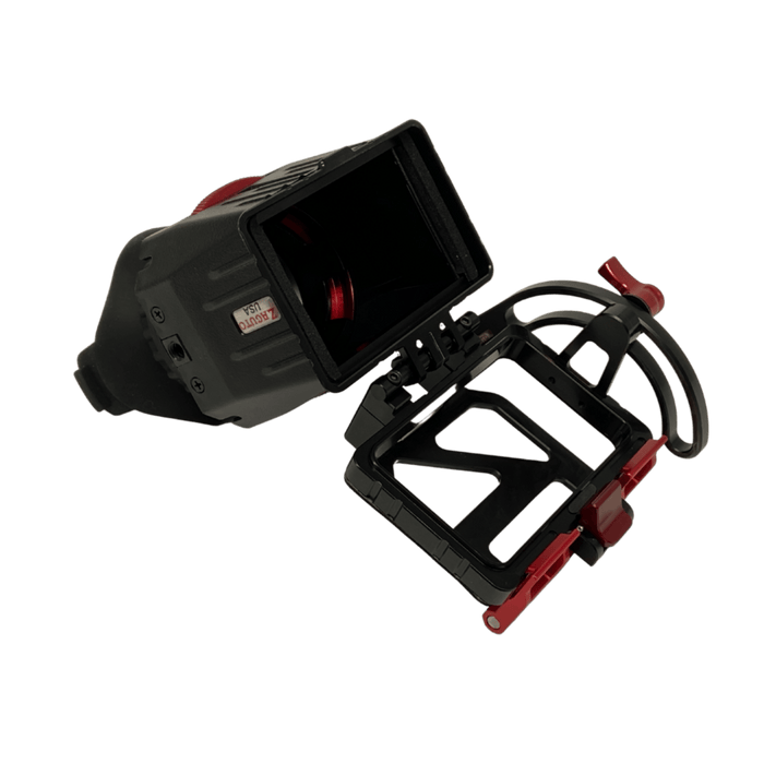El Z-Finder se puede utilizar independientemente de cualquier soporte para cámara. Se monta de forma segura en el gancho de la correa de la cámara, que está integrado en el cuerpo de la cámara, lo que proporciona un punto de montaje sólido como una roca. Colocar y quitar el Z-Finder es tan fácil como girar una palanca y deslizar el Z-Finder hacia adentro o hacia afuera de la pantalla LCD. Cuenta con una funda acolchada de espuma que no dañará ni rayará la pantalla LCD de su cámara.