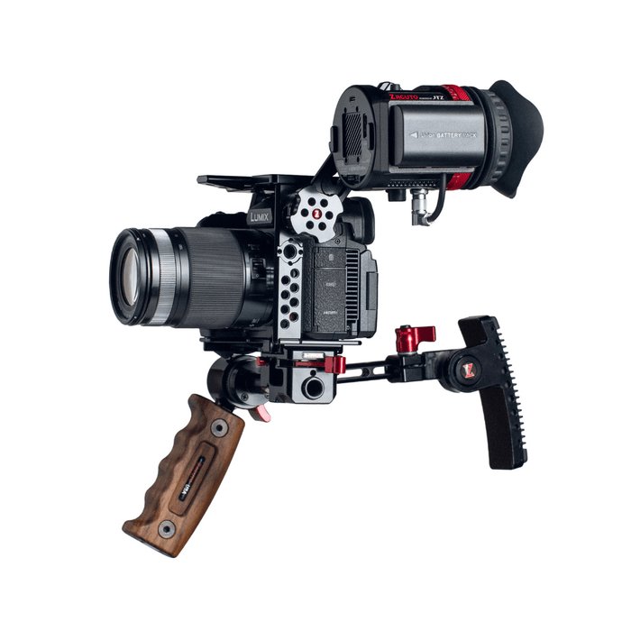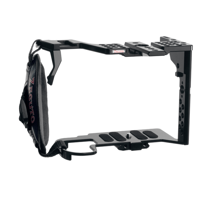 La cámara está asegurada con un tornillo ¼-20 y 2 tornillos laterales montados en los ojales de la correa para el cuello de la cámara, lo que brinda la mayor seguridad para su cámara. Con la jaula bloqueada, hay numerosos orificios de montaje de ¼-20 para colocar accesorios adicionales. Una roseta ARRI en el lateral permite el uso de una empuñadura como la empuñadura Rosette Trigger. Un riel Z (OTAN) integrado a lo largo de la parte superior y lateral proporciona soporte de montaje para manijas y monitores. La jaula también incluye una correa de mano Zacuto, una abrazadera de alivio de tensión HDMI y un adaptador HDMI en ángulo recto.