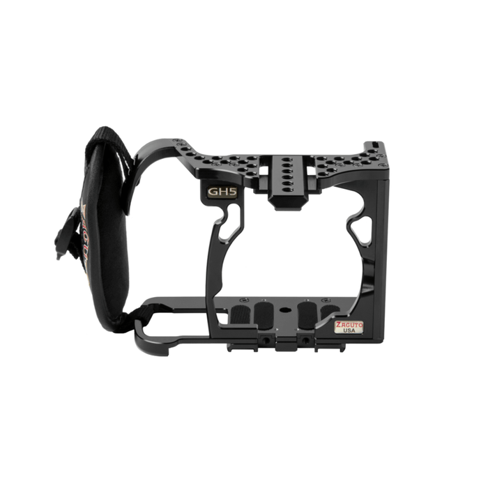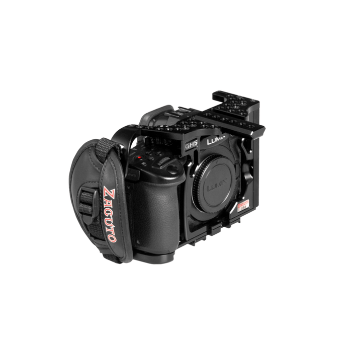 La jaula GH5 es nuestra jaula "sin jaula" compatible con Panasonic GH5, GH5S y GH5M2. Es liviano y compacto, y compatible con el Arca Swiss de Zacuto: el 'ACT Recoil'. ¡Incluye un montón de funciones! La jaula GH5 se atornilla a la parte inferior de la cámara con un tornillo de ¼ 20 proporcionado. También se fija a los lados de la cámara, utilizando la conexión de la correa para el cuello con ojales Panasonic con los tornillos proporcionados. Incluye una correa de mano para cámara Zacuto para un agarre seguro y cómodo de la cámara. La jaula termina en la conexión de la correa para el cuello con ojales, lo que le permite usar la empuñadura incorporada de la cámara, manteniendo la jaula pequeña y liviana y con fácil acceso a todos los controles de la cámara.
