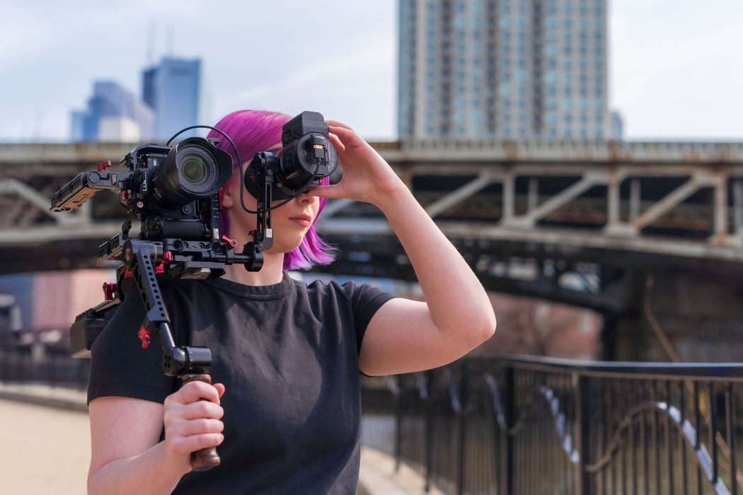El Rotator es ajustable tanto en ancho como en alto para acomodar todas las cámaras. También está diseñado para funcionar con accesorios como el armazón de la cámara, el matte box, el EVF y el follow focus. La posición del EVF es independiente de la cámara, lo que permite al usuario simplemente girar el EVF para realizar tomas horizontales o verticales sin alterar la ergonomía. Tiene una zapata fría incorporada y un accesorio de riel NATO para micrófonos, manijas y otros accesorios. Esto realmente hace que disparar en 9x16 o 16x9 sea muy sencillo. ¡Solo toma unos segundos voltear y ya está listo para comenzar!