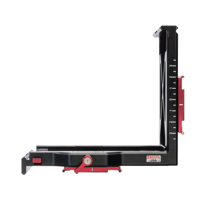 El Zacuto Rotator es un soporte de cámara en forma de L que se utiliza para grabar vídeos verticales (9:16). El Rotator es compatible con nuestra placa base VCT Pro estándar de la industria. Con solo girar la palanca, deslice la cámara hacia afuera, gírela y deslícela nuevamente hacia la placa base.