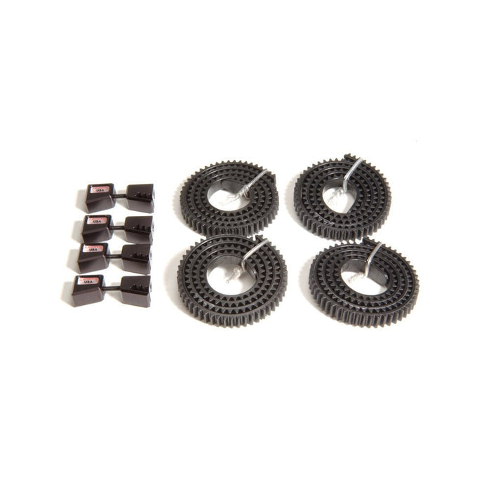 El kit de lentes Zacuto Universal ZipGear Prime incluye cuatro Zacuto Universal ZipGear. Zacuto Universal ZipGear es una correa de paso de 0,8 que se puede conectar a cualquier lente para usar con un equipo de enfoque de seguimiento de paso de 0,8 Zacuto. Esto le permite utilizar lentes no inclinados con un enfoque de seguimiento. Todas las correas tienen 13,5” de largo y están inclinadas a 0,8. El ZipGear Universal funcionará con cualquier lente, fija o zoom. Simplemente envuelva el ZipGear alrededor de la lente y córtelo al tamaño adecuado, presione la carcasa de bloqueo del engranaje y apriete. La instalación tarda un minuto.