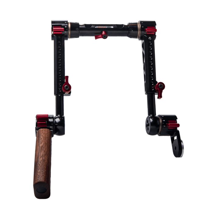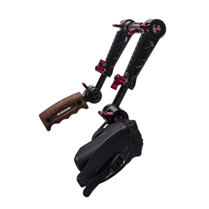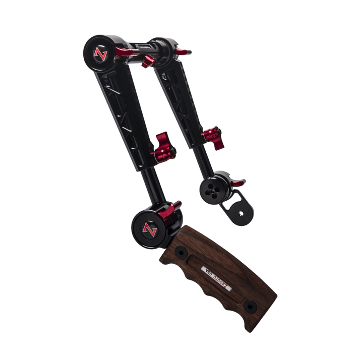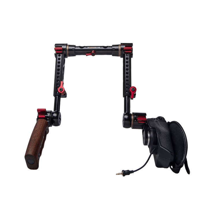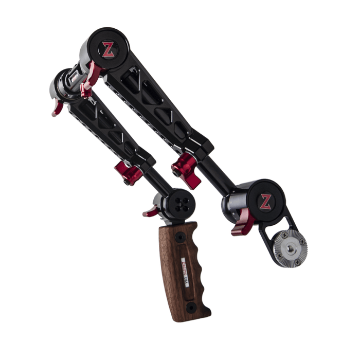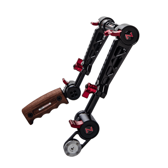 The Rosette Dual Trigger Grips is a dual handgrip system that relocates the any any rosette based camera/lens grip to a comfortable handgrip position for shoulder rigs and gives you a sleek comfortable wooden handgrip on the left side. The Dual Trigger Grip system slides onto 15mm lightweight rods. If you are looking for a single Rosette grip relocator, click here.