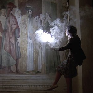 In the following Cathedral scene taken from The English Patient, Kip (Naveen Andrews) shows Hana (Juliette Binoche) some paintings in a very unorthodox way. Kip puts Hana in a harness and lifts her in a hoist armed only with a flare to view them in the darkness. With only one motivational light source from the window and some fill on the floor of the space, the flare was meant to be the key light source for Juliette Binoche’s character. But as John Seale explained, the production design department had provided actual flares for the scene. Flare emissions can burn and the fumes are carcinogenic. So upon insistence for the safety of the crew and Juliette, John and his gaffer came up with a prop that simulated a lit flare with a small light and vapor emitter installed in the tube. Running up the rope in Naveen Andrew’s right hand are internal cables that are powering both the light and smoke emitter. This solution meant that Juliette could hold the “flare” closer and higher to her face, thus fulfilling its purpose to have her photographed and exposed properly, and more importantly, beautifully. john seale zacuto english patient