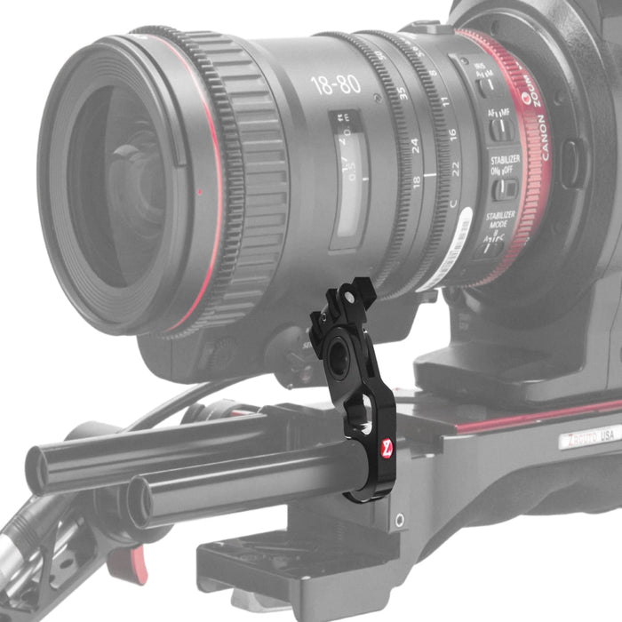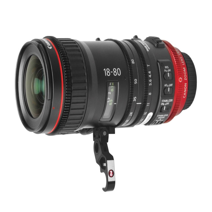 This Lens Support is a foldable lightweight support that works with any height adjustable 15mm rod. This Lens Support screws into the 18-80 in place of the Canon ¼ 20 support foot. Using the turn of the EF lens, the support firmly clips into place on the 15mm rod. When not in use it folds against the lens for easy storage.