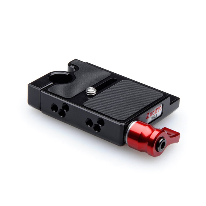 There is a 15mm rod port on the underside of the Gorilla Plate V2 controlled by a Zacuto quick release ratcheting lever.