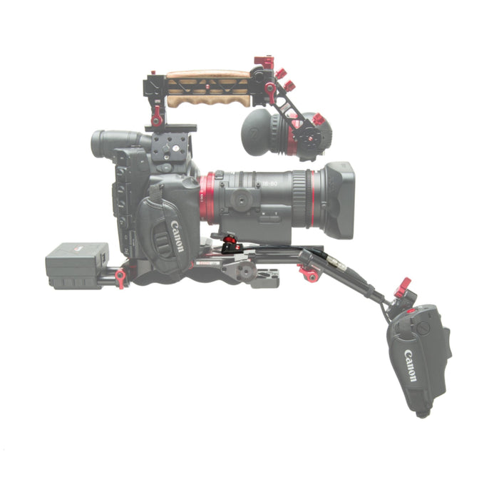 El soporte para lentes es un soporte liviano y plegable que funciona con cualquier varilla de 15 mm de altura ajustable. El soporte de la lente se atornilla a la lente 18-80 o 70-200 en lugar del pie de soporte Canon ¼ 20. Usando el giro de la lente EF, el soporte se engancha firmemente en su lugar en la varilla de 15 mm. Cuando no está en uso, se pliega contra la lente para facilitar su almacenamiento.