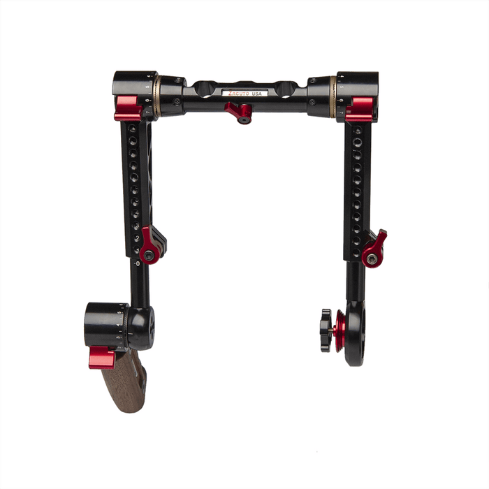 Nuestras empuñaduras de gatillo son las empuñaduras más ajustables disponibles. Permiten una rotación de 360° con una sola mano con solo presionar un gatillo. Los dos mangos giran independientemente uno del otro. Gírelos hacia abajo para obtener un agarre bajo y sólido como una roca. Levántelo para obtener una posición más estilo Aaton. O gírelos rápidamente hacia arriba para colocar la cámara en el suelo o guardarla en un estuche. O escalonarlos si eso le resulta más cómodo. La longitud de las empuñaduras también se puede ajustar aflojando una palanca roja y tirando o empujando la empuñadura hacia adentro.