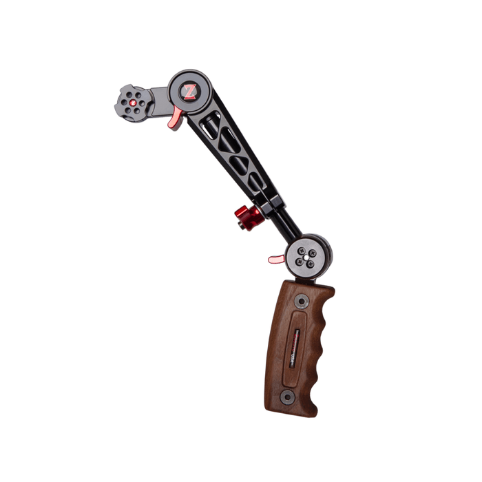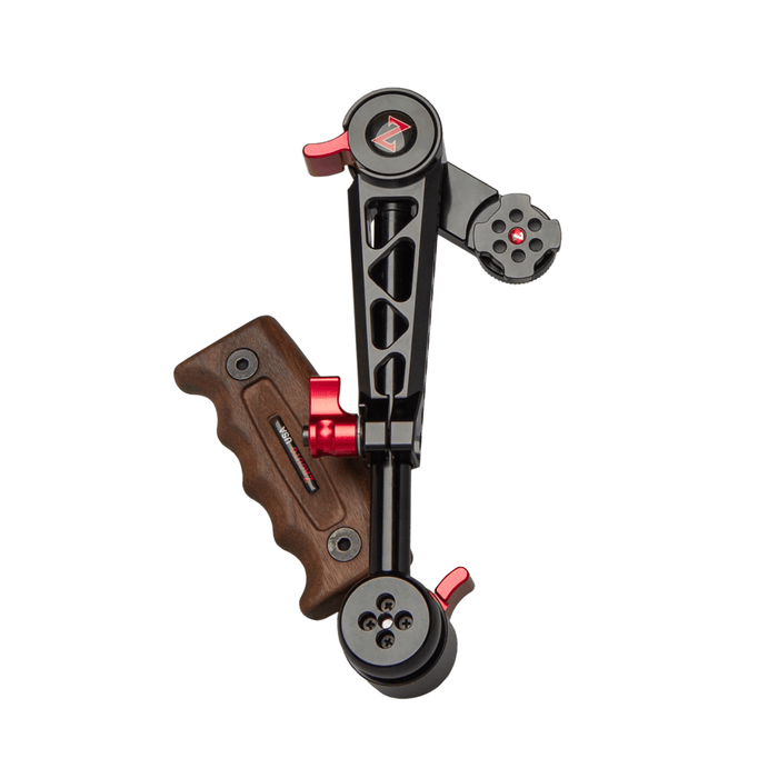 Nuestras empuñaduras de gatillo son las empuñaduras más ajustables disponibles. Permiten una rotación de 360° con una sola mano con solo presionar un gatillo. Los dos mangos giran independientemente uno del otro. Gírelos hacia abajo para obtener un agarre bajo y sólido como una roca. Levántelo para obtener una posición más estilo Aaton. O gírelos rápidamente hacia arriba para colocar la cámara en el suelo o guardarla en un estuche. O escalonarlos si eso le resulta más cómodo. La longitud de las empuñaduras también se puede ajustar aflojando una palanca roja y tirando o empujando la empuñadura hacia adentro.