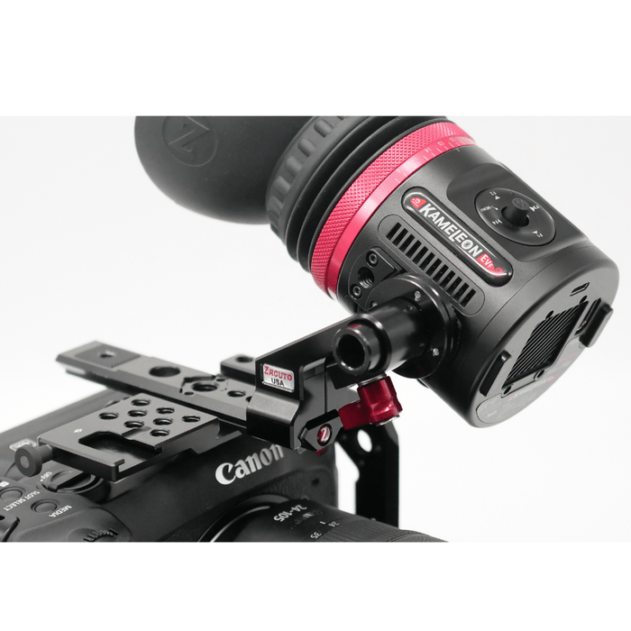 El soporte Z-Rail Rosette es un soporte de riel Z-Rail (NATO) multifuncional. Se desliza sobre cualquier riel y le brinda una roseta de ¼”-20 o un puerto de varilla de 15 mm para montar accesorios. Es perfecto para montar un EVF basado en roseta como el Kameleon EVF o usar una montura Axis Micro o Axis Mini EVF para montar el Kameleon EVF. Proporciona un puerto de varilla de liberación rápida de 15 mm con un adaptador de roseta perpendicular al Z-Rail. Sale del Z-Rail en un ángulo de 45 grados para llevarlo más hacia adelante y hacia arriba para una solución de montaje óptima. Esta es la solución perfecta para montar el Kameleon EVF encima de una de nuestras jaulas con Z-Rail integrado.